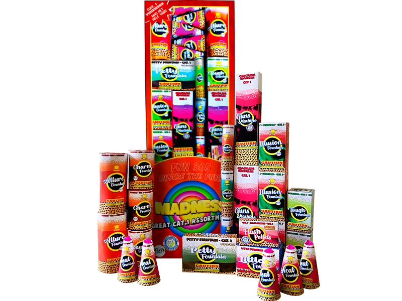 Madness nDit is echt gekkenwerk..XL box vol met categorie 1 vuurwerk. Genoeg om te delen! n nKruitgewicht 275 Gram nTube diameter – nBrandtijd – Seconden nHoogte –